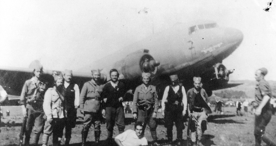 Photos: Chetniks pose in front of one C-47 planes that came during the daytime on August 10. Airmen enter the plane. Plow marks are visible on the ground, but they were not a problem for Dakota's big wheels, which were made for such rough landing fields.